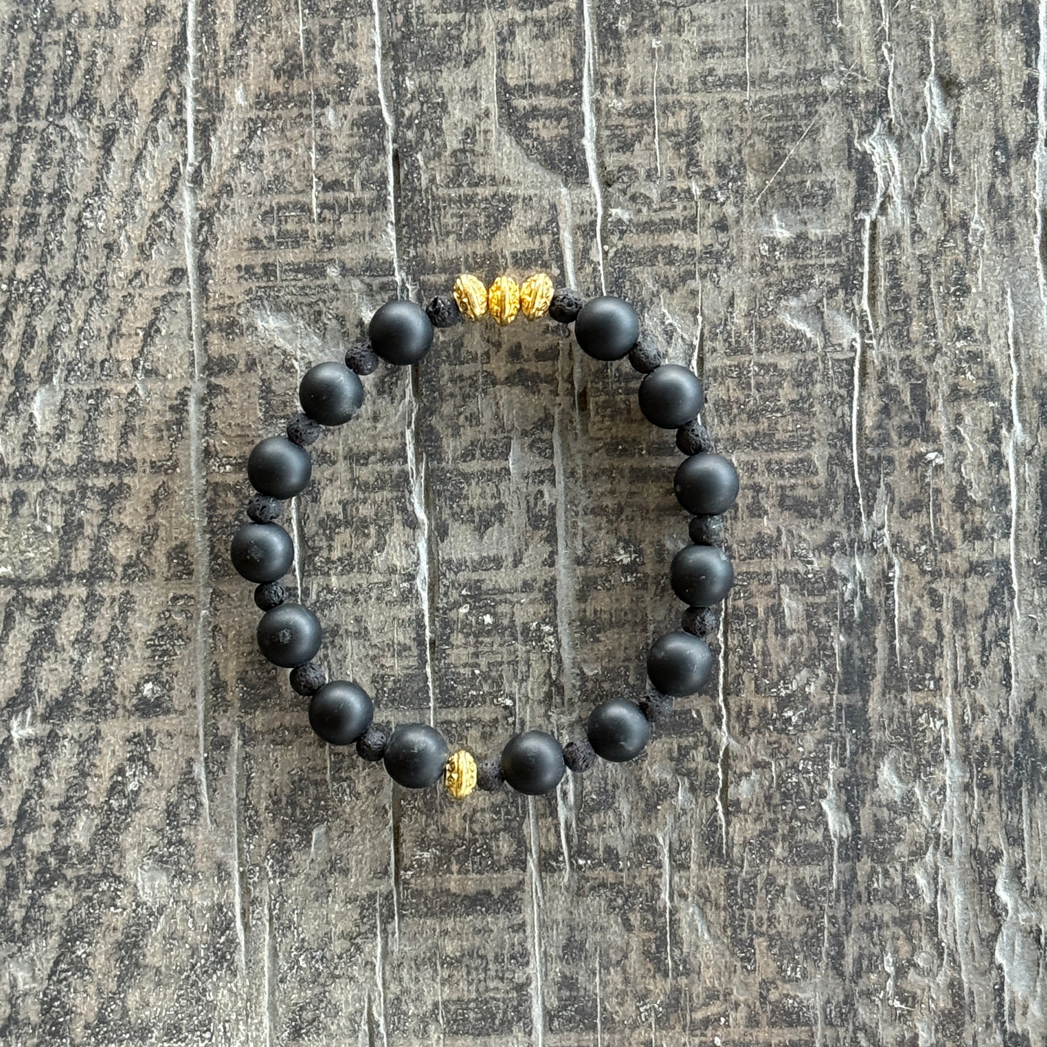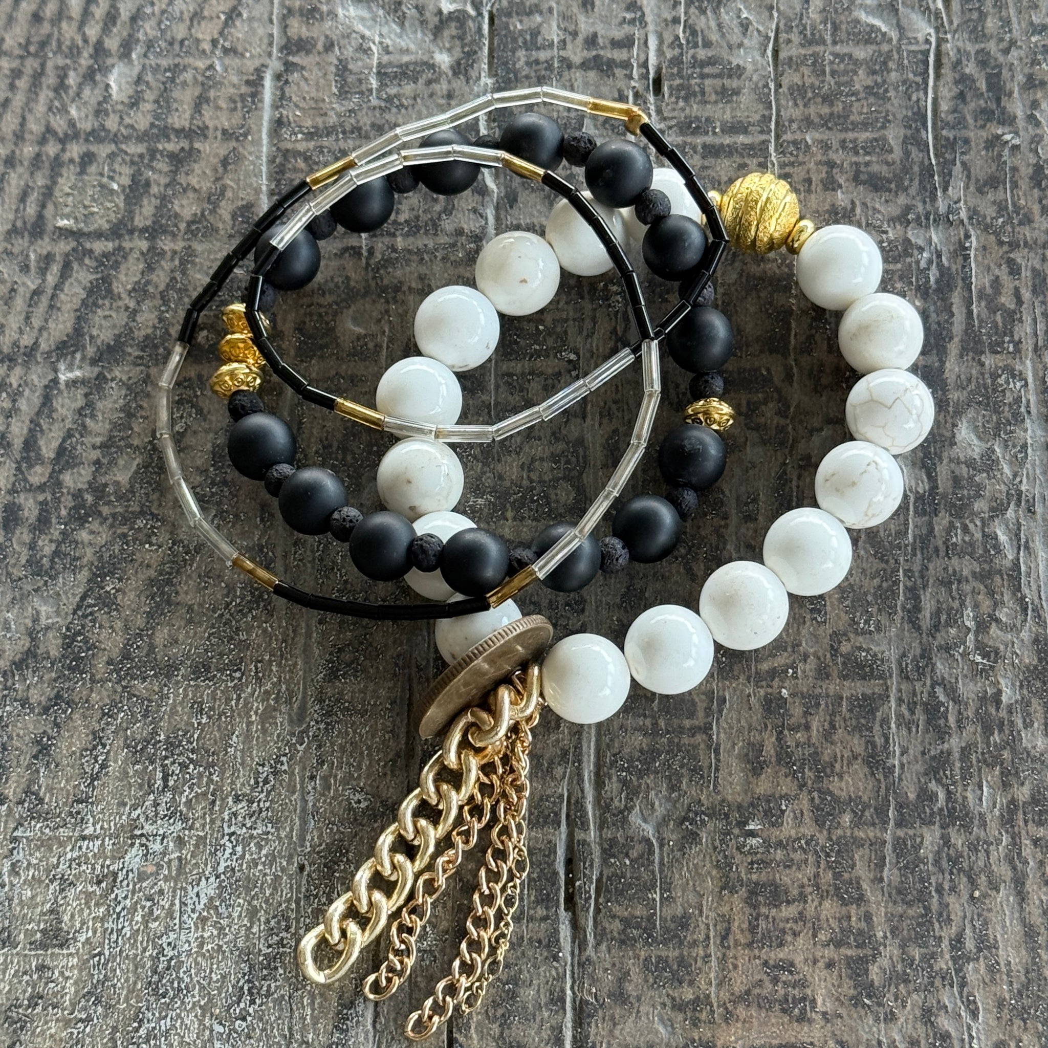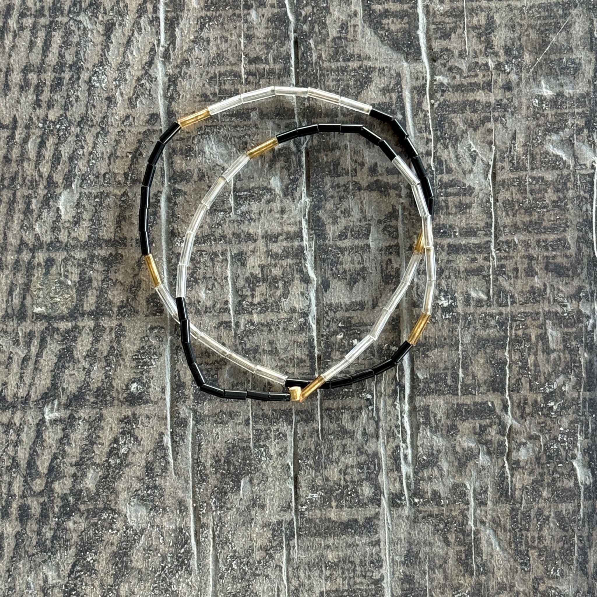 All bracelets are elastic and stretch over the hand. They are handmade in the USA. Unless otherwise specified any metal descriptions indicating gold, silver, bronze, etc. are intended to describe color and not the actual metal material.