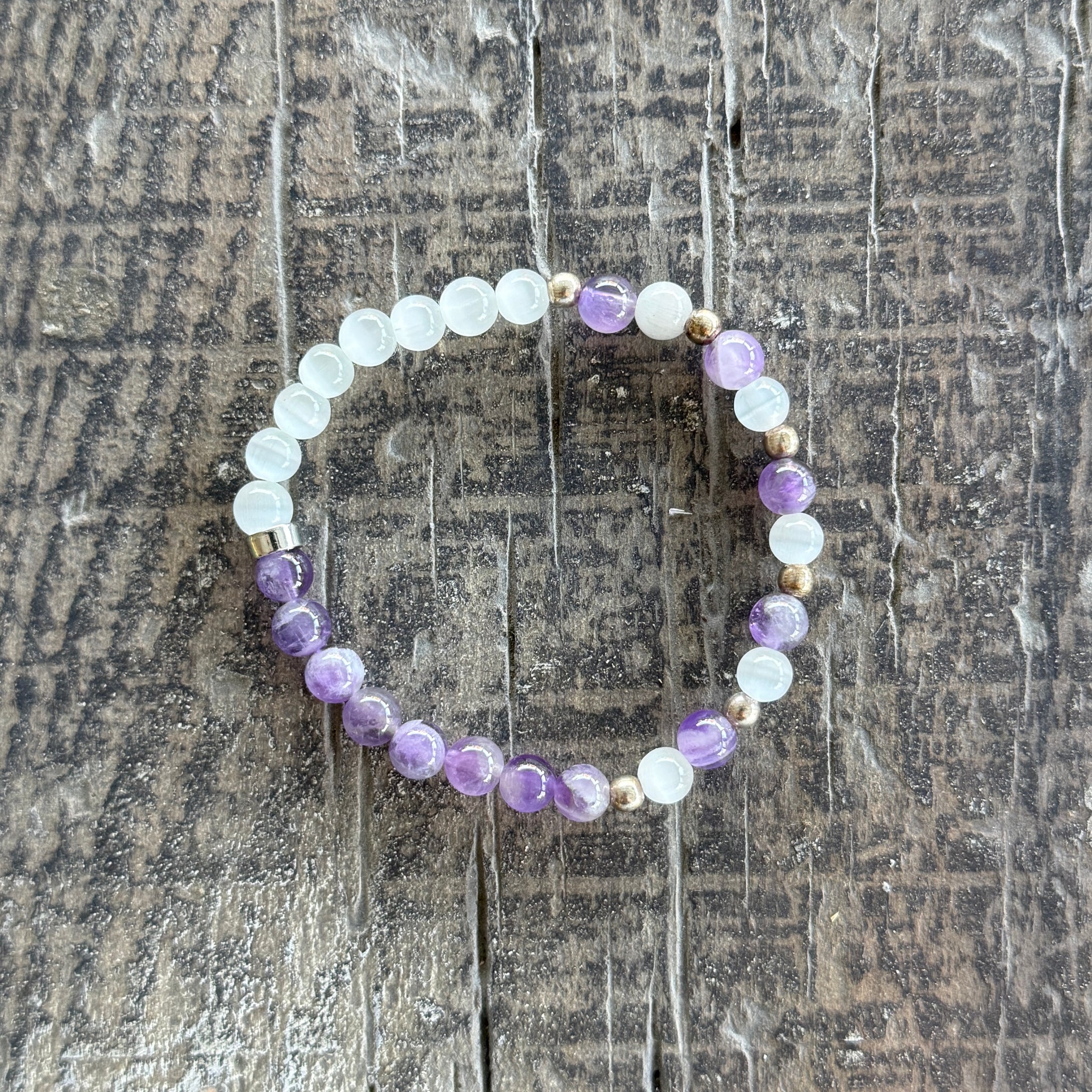 - Amethyst, white Cat's Eye, and silver spacers