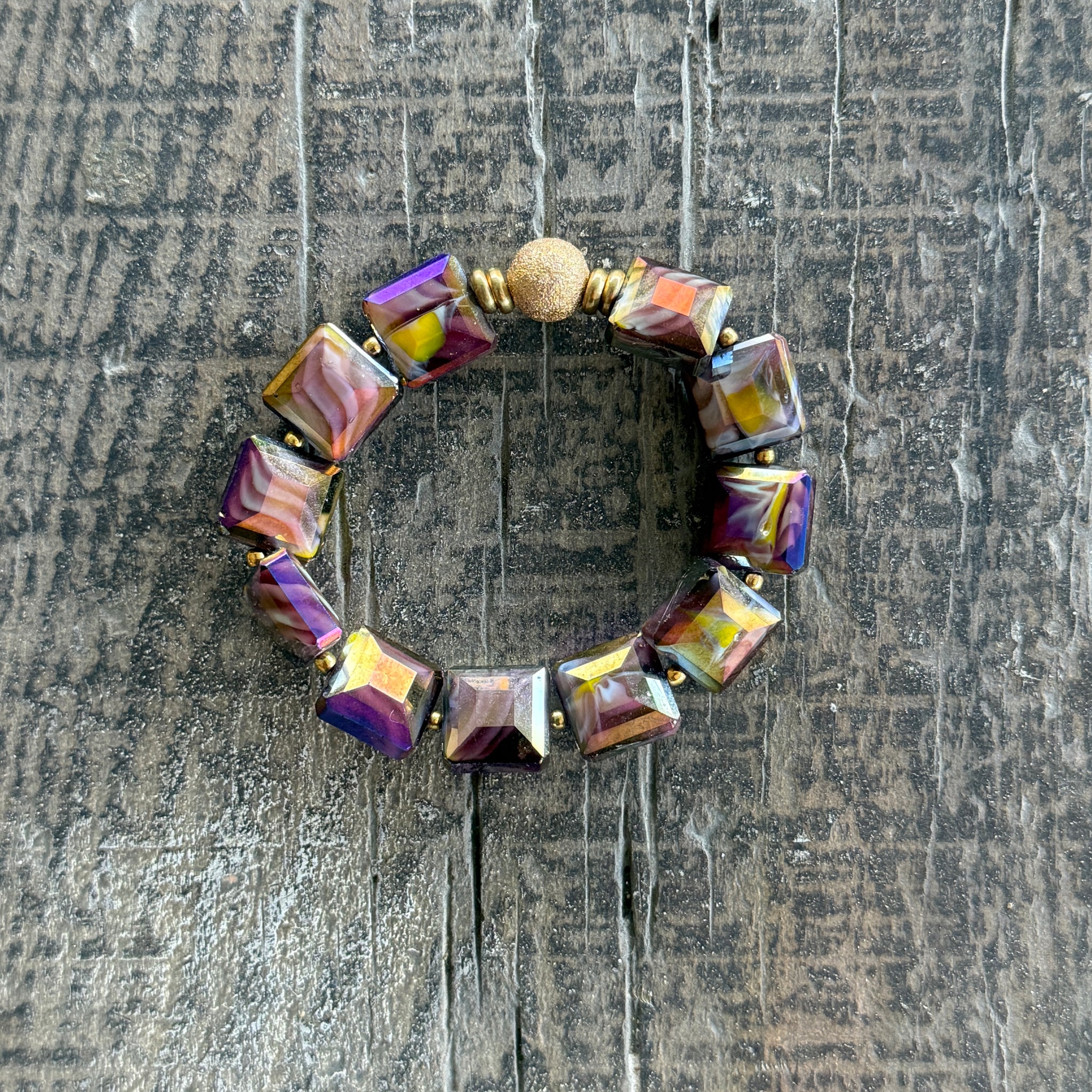 - Purple irridescent rectangular glass beads, gold stardust ball and gold spacers