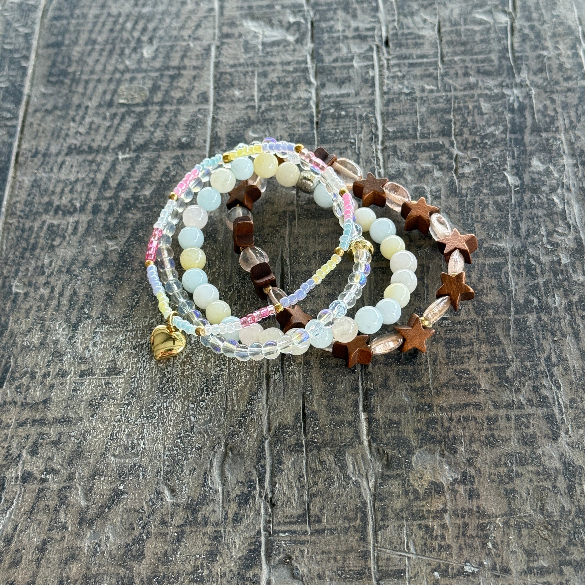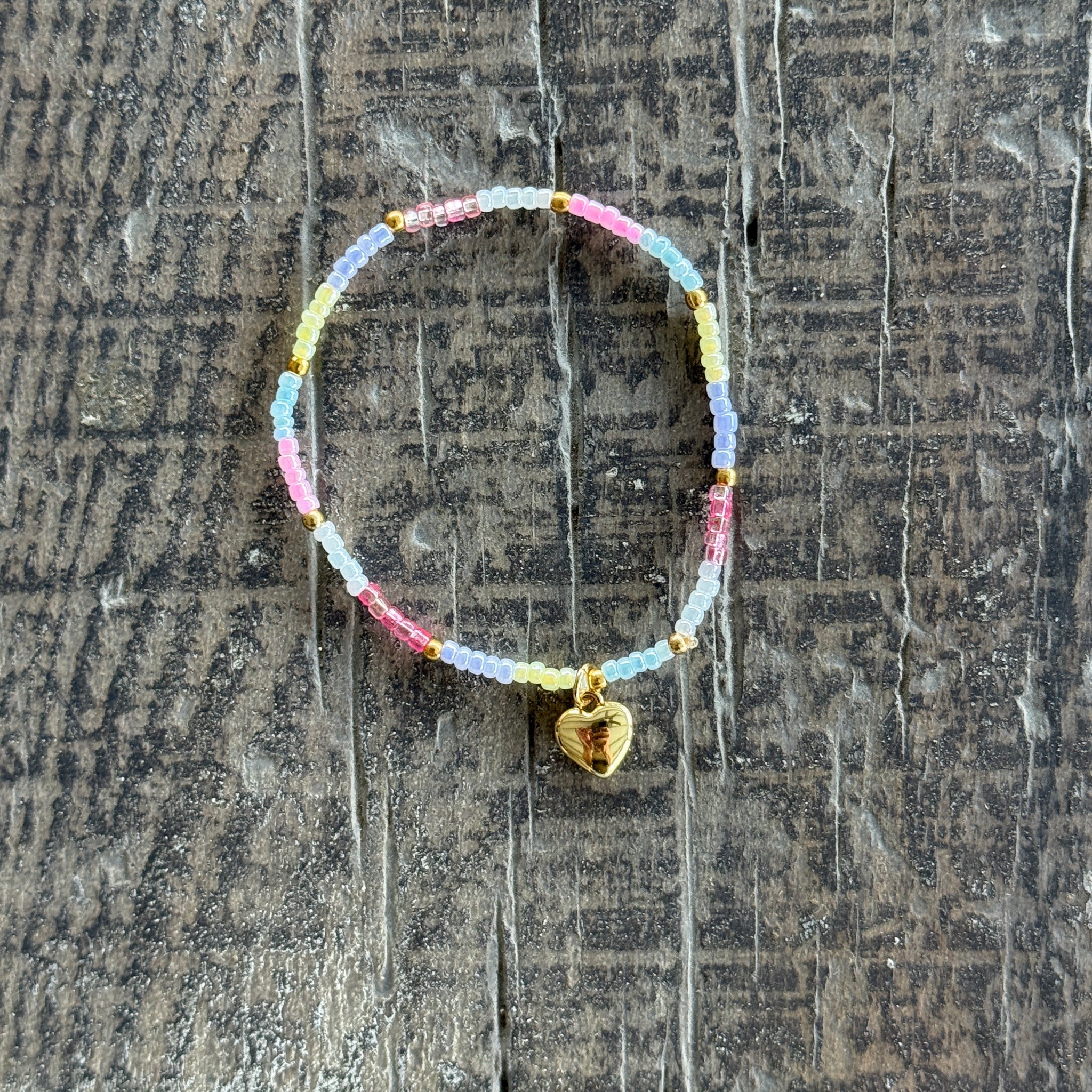 - Pastel seed beads and gold-filled heart charm