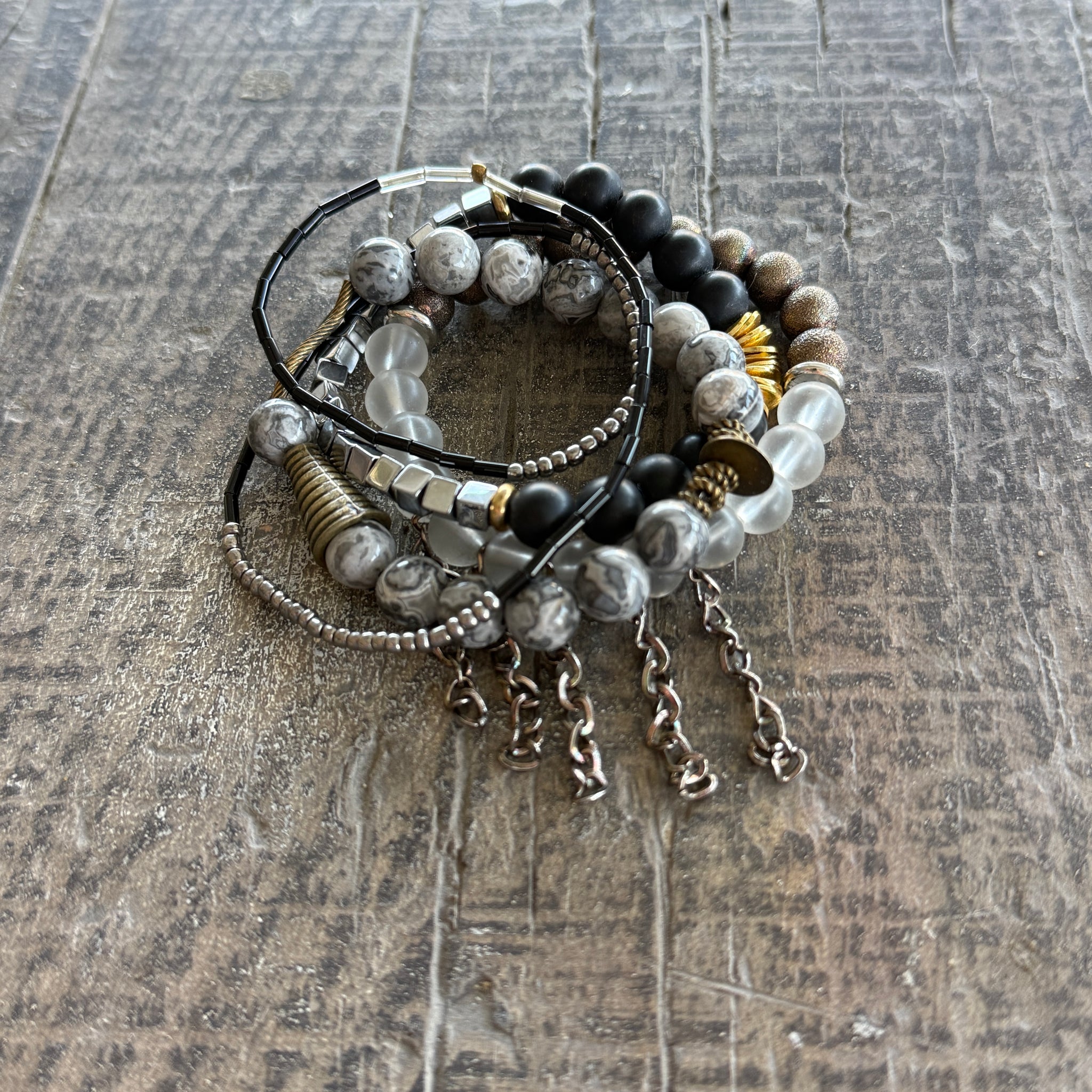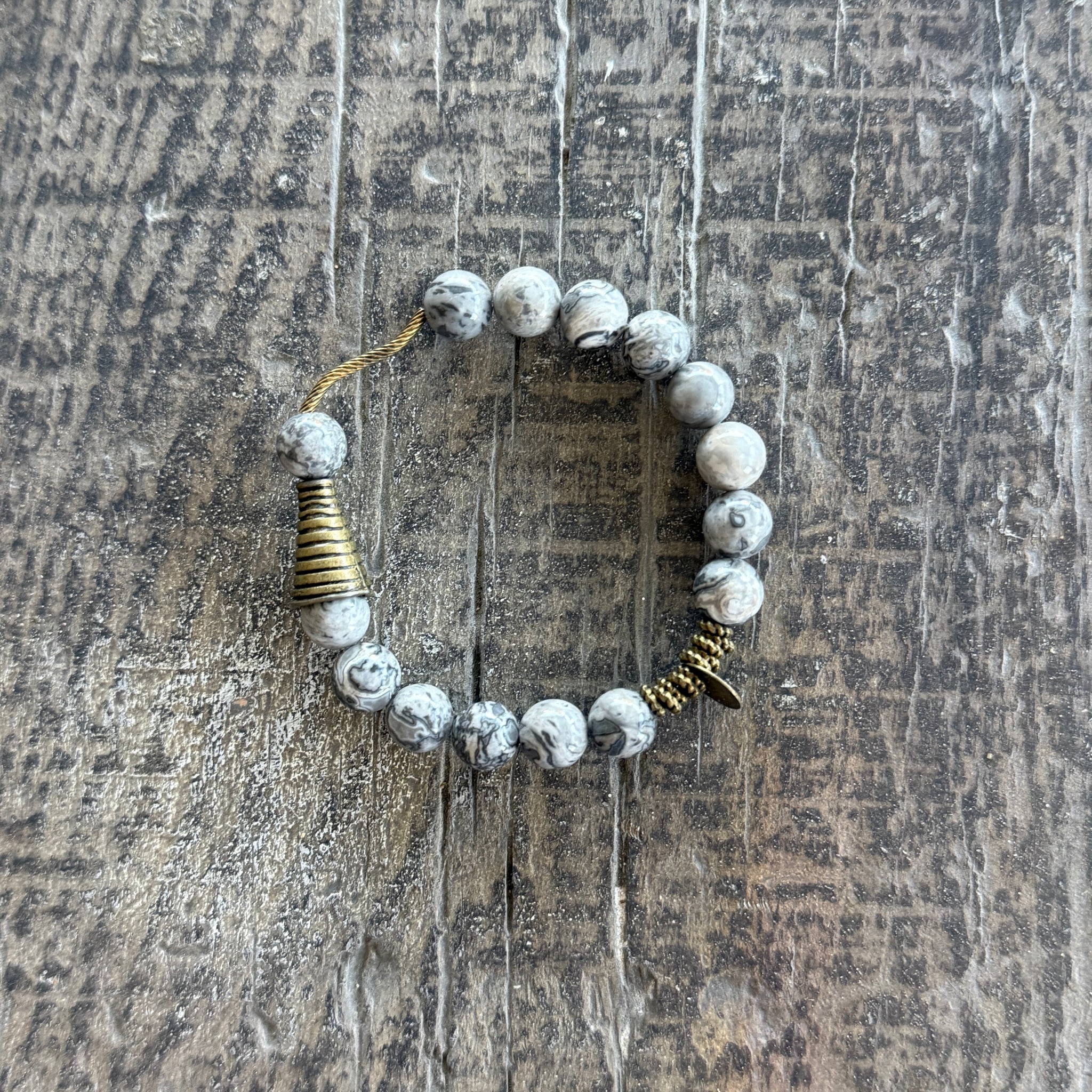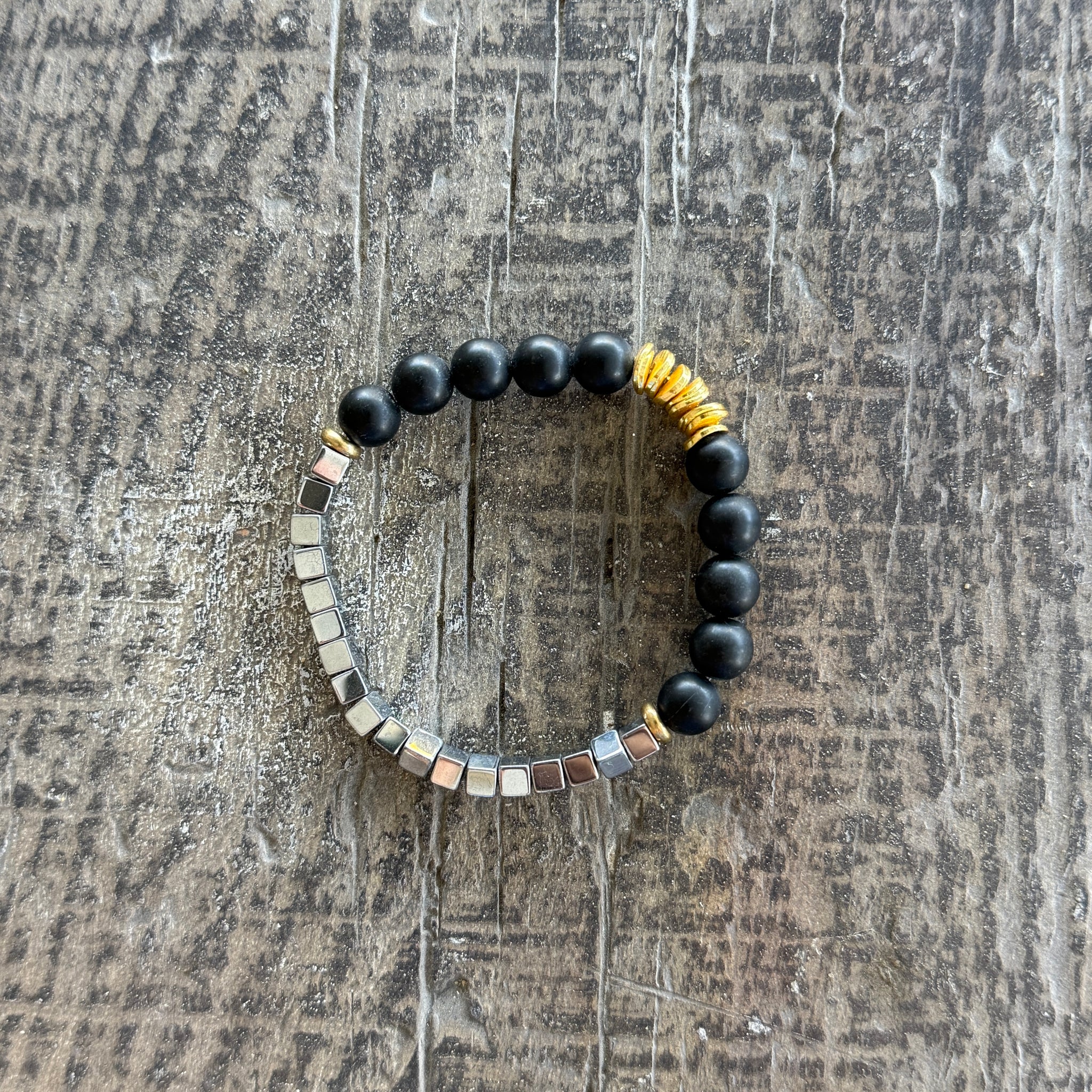 All bracelets are elastic and stretch over the hand. They are handmade in the USA. Unless otherwise specified any metal descriptions indicating gold, silver, bronze, etc. are intended to describe color and not the actual metal material.