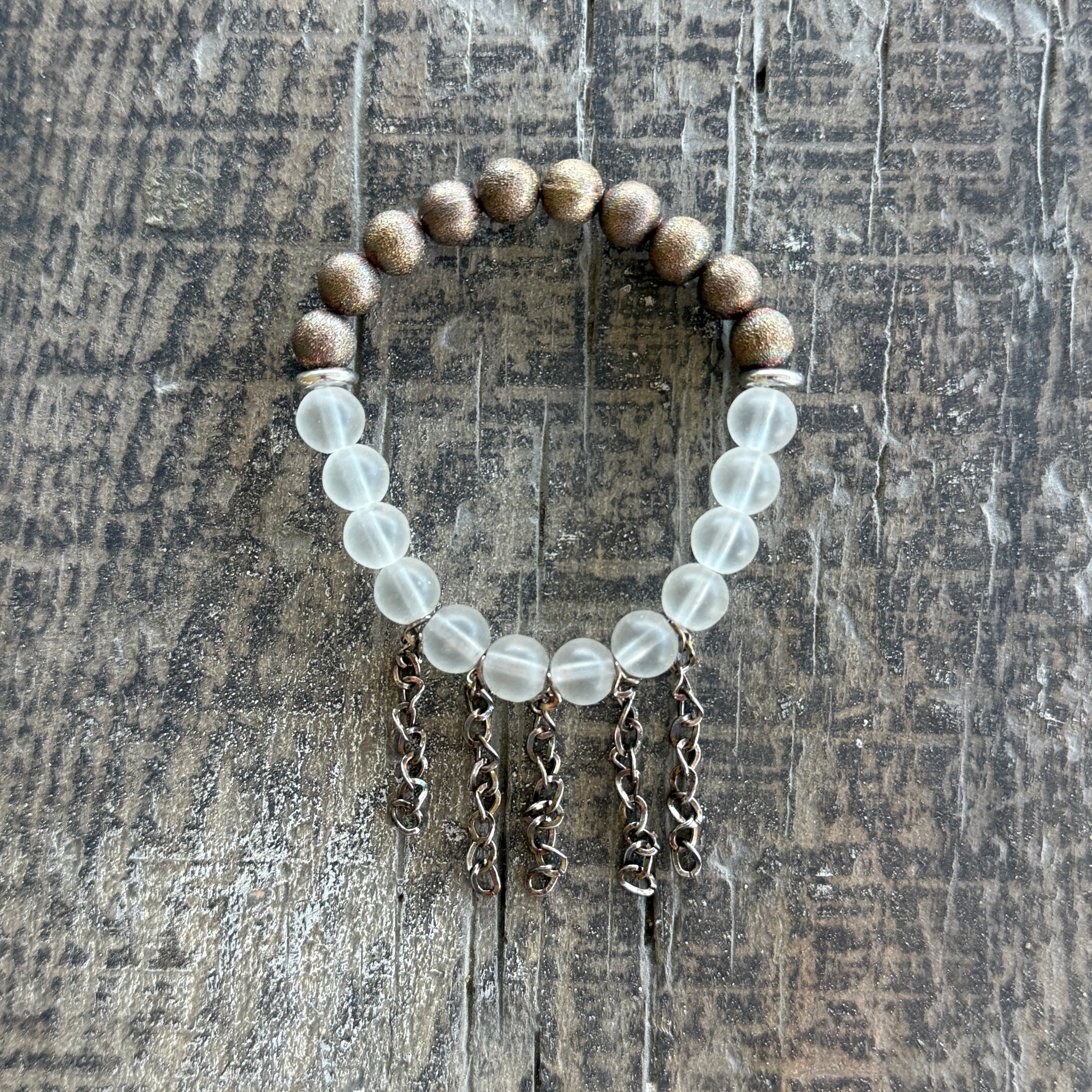 - Frosted glass beads, antiqued stardust ball, and silver chain