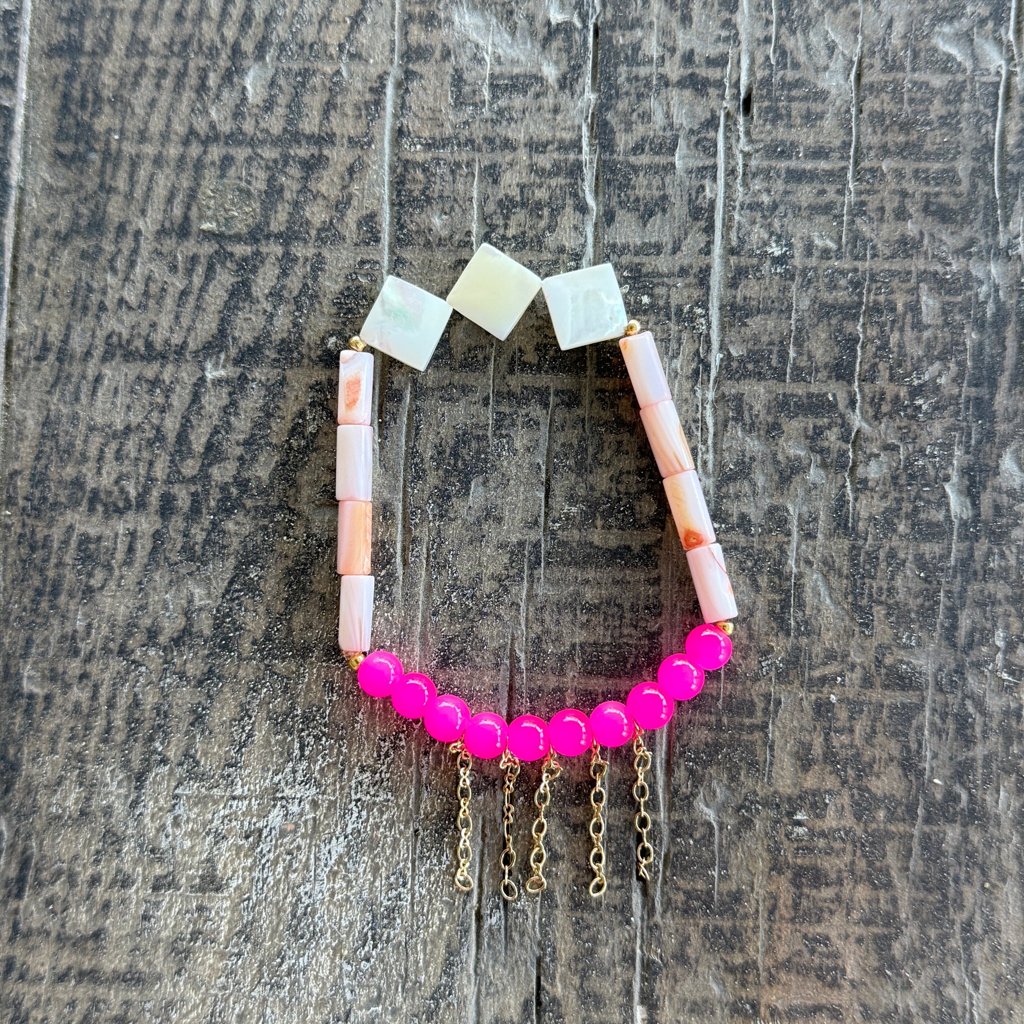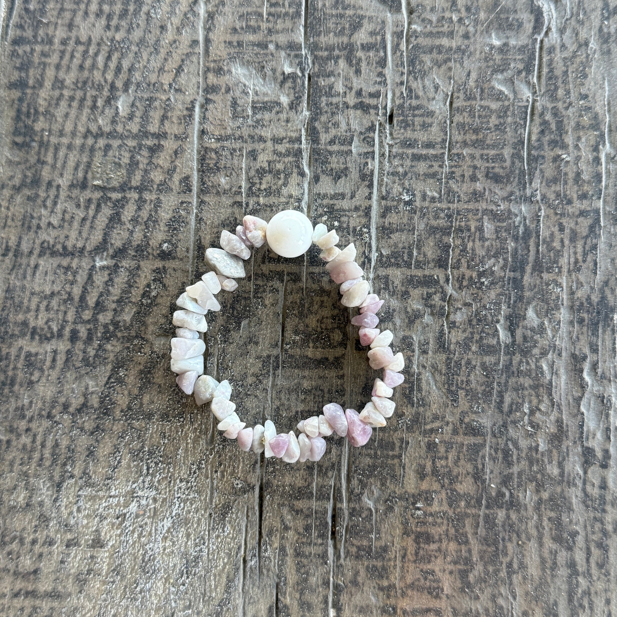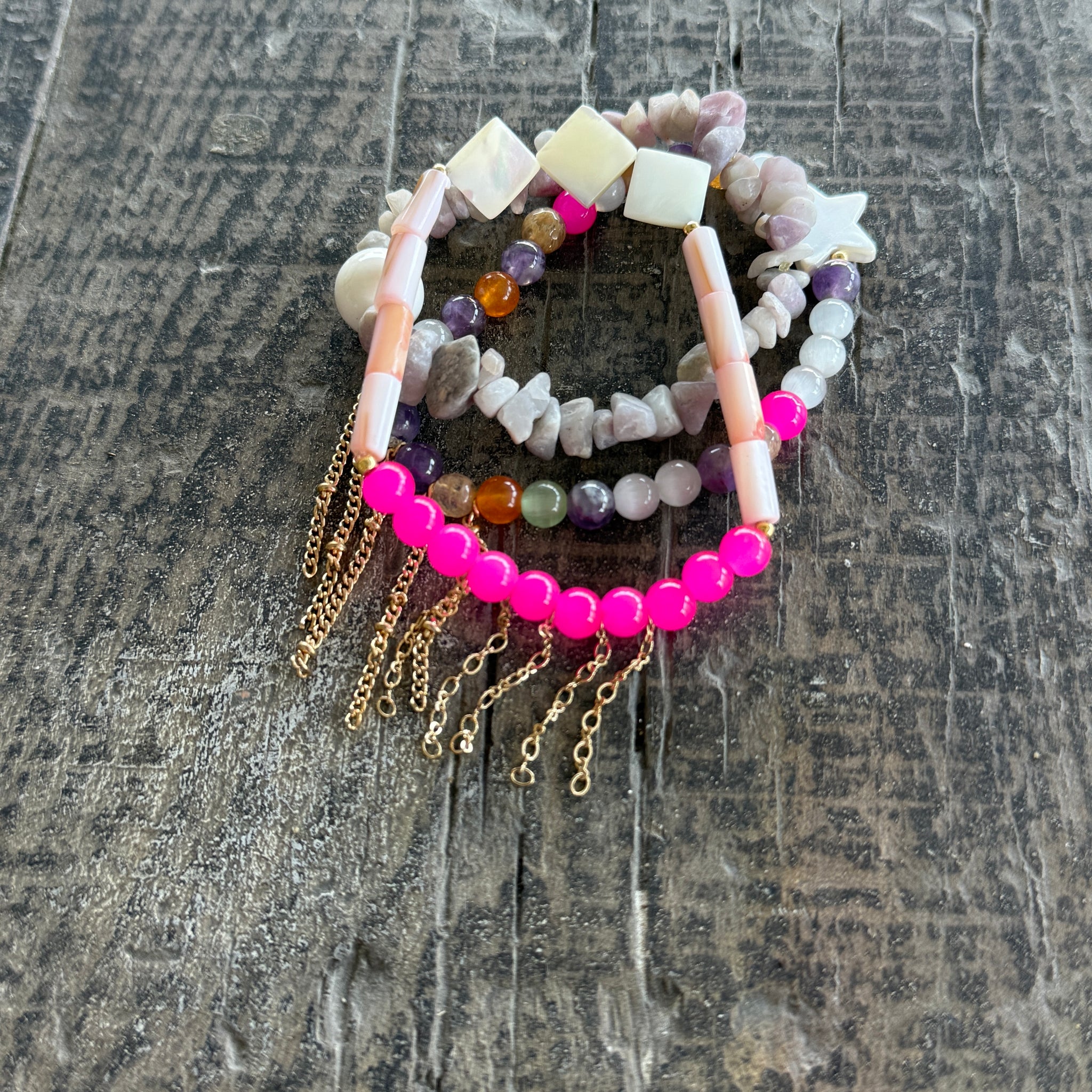 All bracelets are elastic and stretch over the hand. They are handmade in the USA. Unless otherwise specified any metal descriptions indicating gold, silver, bronze, etc. are intended to describe color and not the actual metal material.