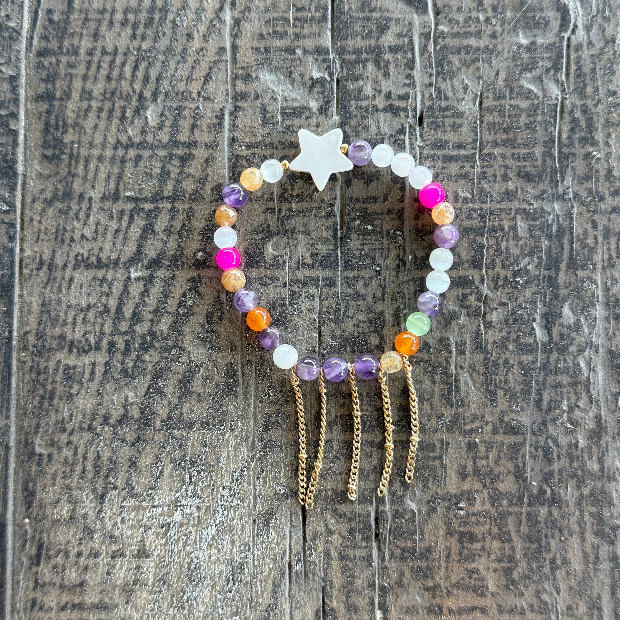 - Star Shell, Amethyst, Citrine, glass Cat's Eye, glass beads and gold chain
