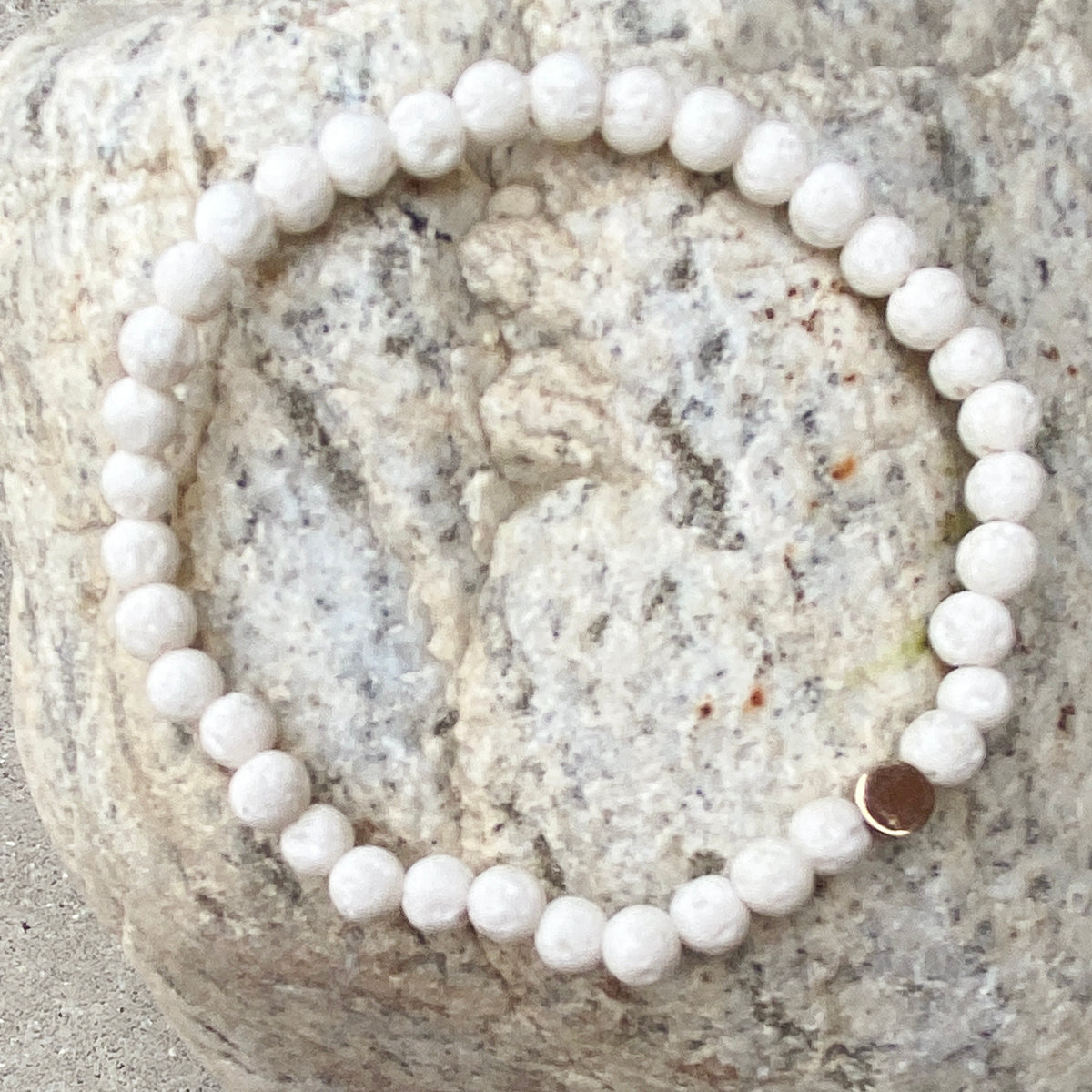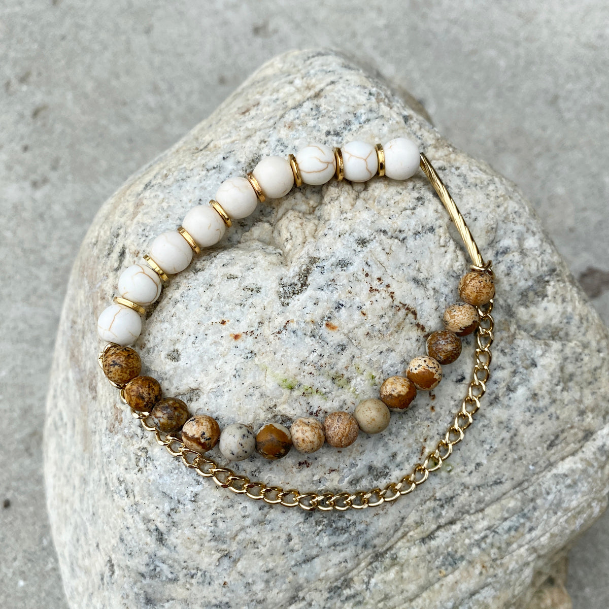(1) 8mm Howlite, 6mm matte Jasper, and gold chain and accent pieces.