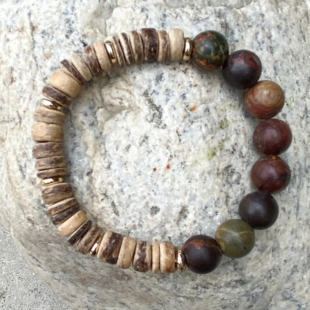 (4) 10mm Picture Jasper, coconut shell beads, and gold spacers.